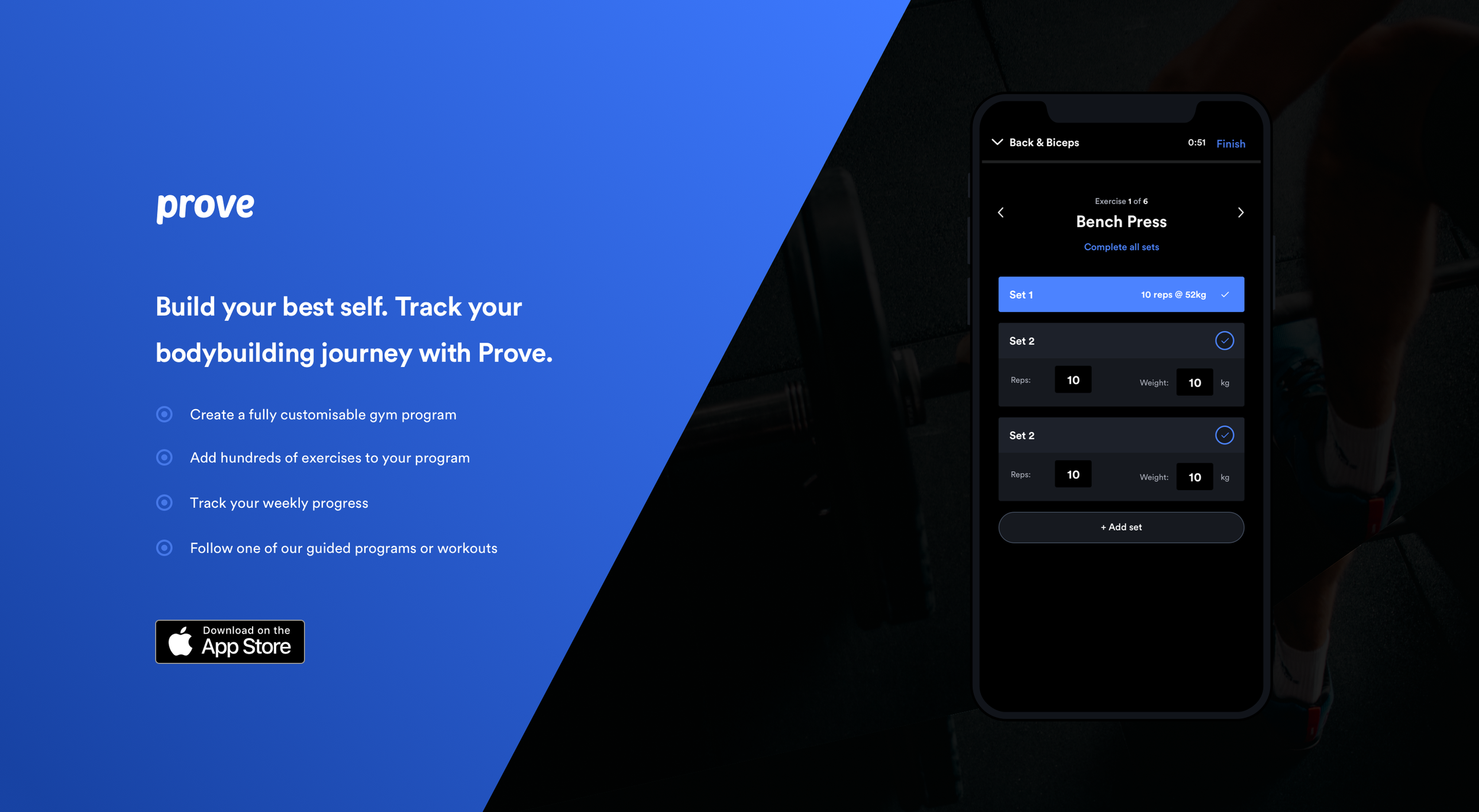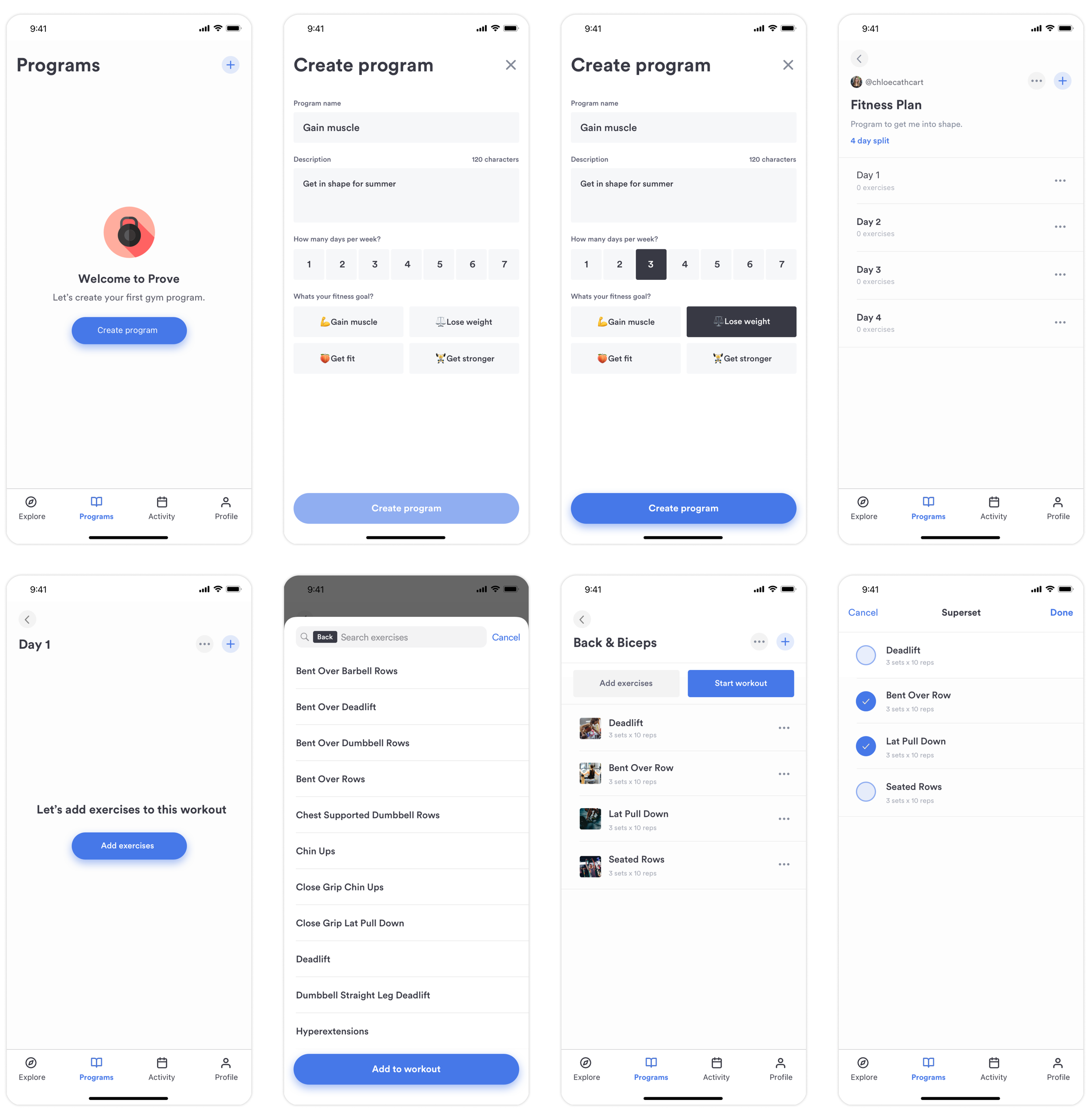 Prove is a self-initiated mobile app concept designed to support focused, goal-driven weight training in the gym. I created Prove to explore mobile UX patterns in fitness tracking, with an emphasis on progressive overload, session logging, and workout history. The interface is clean and minimal, prioritising quick input and in-the-moment usability. I designed intuitive flows for building workouts, tracking sets and reps, and reviewing performance over time. This project challenged me to design an experience that keeps users motivated to train regularly, using data visualisation and thoughtful interaction design to make progress tracking simple and rewarding.
